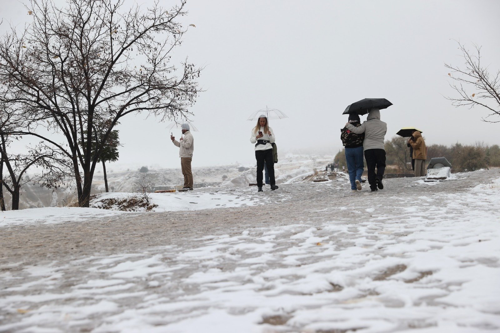 Türkiye’nin tarihi, kültürel ve doğal güzellikleriyle bezeli turizm bölgesi Kapadokya’da, mevsimin ilk karı peribacalarıyla kaplı vadilerde masalsı manzara oluşturdu.